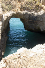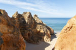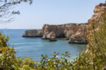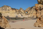 Um die Mittagszeit erreichen wir Praia da Marinha. Der Küstenabschnitt ist geprägt von ausgehöhlten Sandsteinen, schroff abfallenden Klippen und dazwischen gelegenen Sandstränden. Auf der Karte reiht sich eine fotogene Stelle an die andere. Allerdings ist es nicht ganz einfach, einen Parkplatz zu finden. Anscheinend ist die Küste auch außerhalb der Saison stark frequentiert. Mit etwas Glück finden wir auf dem naturbelassenen Parkplatz eine Stelle zwischen den Büschen. Würden die Fahrer der kleineren PKW etwas Rücksicht nehmen und nicht mit Vorliebe Kurven und Durchfahrten zuparken, wäre die Sache etwas einfacher. So wird die Weiterfahrt zur Zentimetersache.