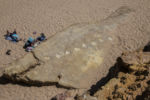 Auf der Weiterfahrt in Richtung Cape Sagres machen wir noch einen Abstecher nach Salema. Mit etwas Mühe gelingt es uns tatsächlich, die im Reiseführer erwähnten Fußspuren der Dinosaurier zu finden. Der Stein mit den jahrmilionen alten Spuren liegt ganz unspektakulär am Strand.