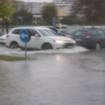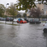 Schon während der Stadtbesichtigung begann es zu regenen. Dennoch hatten wir die Hoffnung, noch einen Besuch in den Orten Abano Terme oder Montegrotto Terme anschließen zu können. Auf dem Weg dorthin wurde der Regen allerdings sintflutartig. So blieb uns nichts anderes übrig, als auf dem Parkplatz in Abano Terme auszuharren. Dabei stieg das Wasser auf der Parkplatzfläche soweit, dass auch die Grasinseln zwischen den Stellflächen überschwemmt wurden.